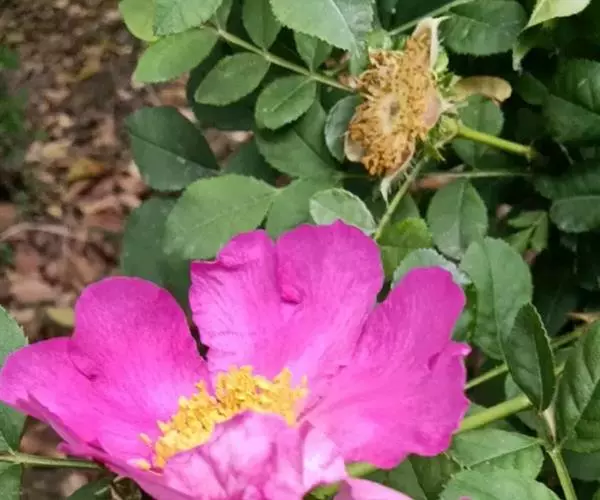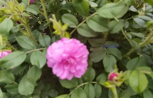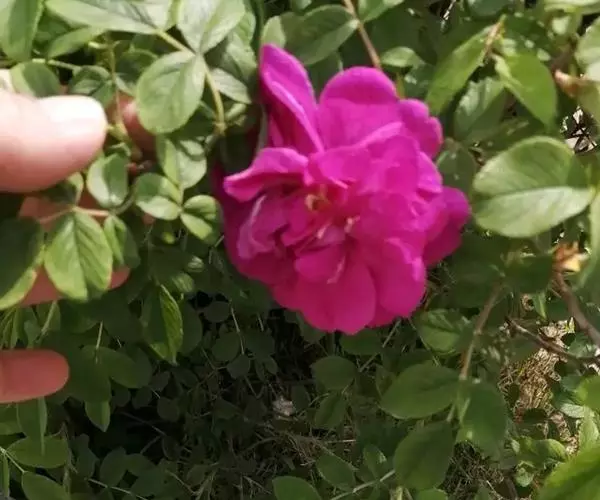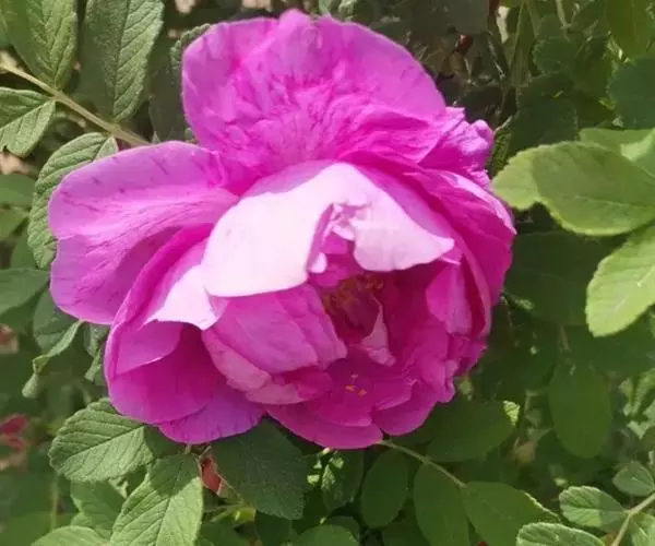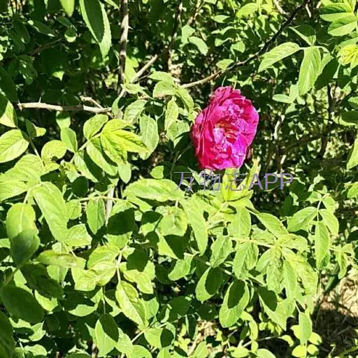 直立灌木,高可达2米;茎粗壮,丛生;小枝密被绒毛,并有针刺和腺毛,有直立或弯曲、淡黄色的皮刺,皮刺外被绒毛。小叶5-9,连叶柄长5-13厘米;小叶片椭圆形或椭圆状倒卵形,长1.5-4.5厘米,宽1-2.5厘米,先端急尖或圆钝,基部圆形或宽楔形,边缘有尖锐锯齿,上面深绿色,无毛,叶脉下陷,有褶皱,下面灰绿色,中脉突起,网脉明显,密被绒毛和腺毛,有时腺毛不明显;叶柄和叶轴密被绒毛和腺毛;托叶大部贴生于叶柄,离生部分卵形,边缘有带腺锯齿,下面被绒毛。花单生于叶腋,或数朵簇生,苞片卵形,边缘有腺毛,外被绒毛;花梗长5 -22.5毫米,密被绒毛和腺毛;花直径4-5.5厘米;萼片卵状披针形,先端尾状渐尖,常有羽状裂片而扩展成叶状,上面有稀疏柔毛,下面密被柔毛和腺毛;花瓣倒卵形,重瓣至半重瓣,芳香,紫红色至白色;花柱离生,被毛,稍伸出萼筒口外,比雄蕊短很多。果扁球形,直径2-2.5厘米,砖红色,肉质,平滑,萼片宿存。花期5-6月,果期8-9月。 粉玫瑰