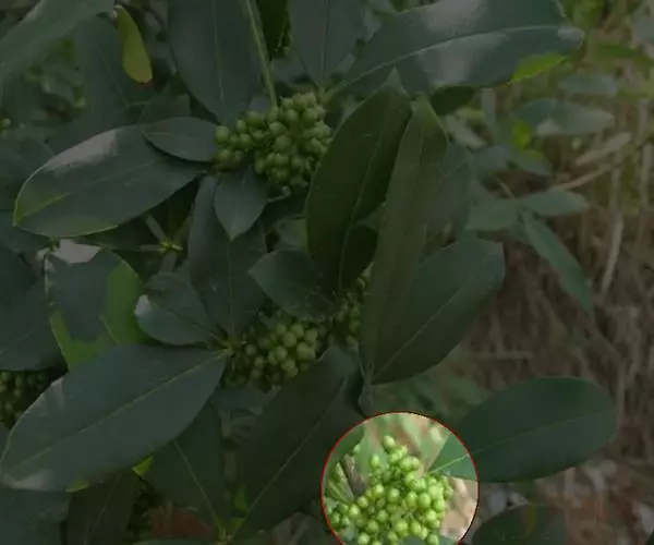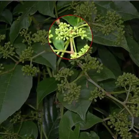 伞房状圆锥花序,顶生,长3-8厘米;花小而多,青色,单性,萼片及花瓣均5片;花瓣淡黄白色,长约2毫米。雌花有心皮3-5个。