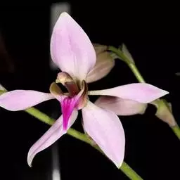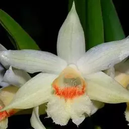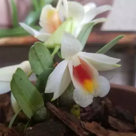 具槽石斛(学名:Dendrobium stuposum Lindl.):茎通常直立,肉质,扁棒状,下部收狭为细圆柱形,不分枝,具纵条纹和数个节。叶纸质,数枚,互生于茎的近顶端,常斜举,长圆形。总状花序从当年生具叶的茎上端发出,长8-15厘米,下垂,密生少数至多数花;花质地薄,白天张开,晚间闭合,奶黄色;花瓣近倒卵形,长2.4厘米,宽1.1厘米,先端锐尖,基部收狭为短爪,具5条脉;唇瓣的颜色较深,呈橘黄色,近基部两侧各具1个褐色斑块,近圆形。花期6月。