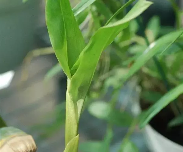 矮石斛:茎直立或斜立,粗短,纺锤形或短棒状,具许多波状纵条棱和2-5节。叶2-4枚,近顶生,革质,…