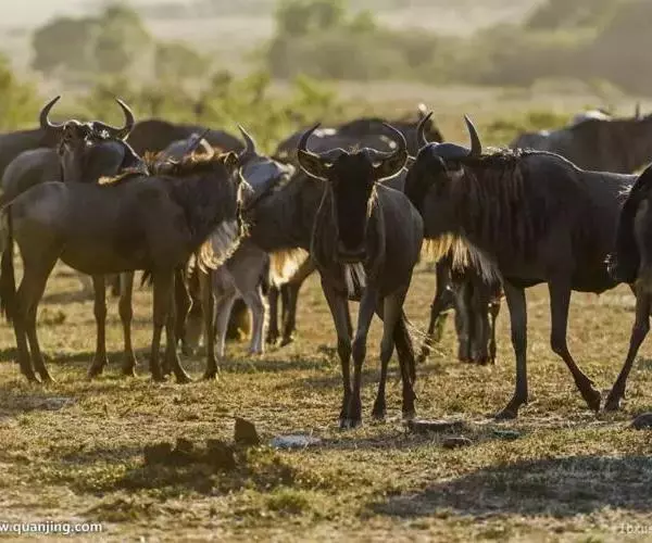 角马生活在非洲广阔的草原上。雨季期间,雨水充足,角马栖息在广阔的草原上。但到了旱季,为了寻找新鲜的草料,非洲角马不得不离开这里,它们聚集起来,数量多达150万头,成群结队地去寻找食物,每天要走48公里。