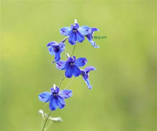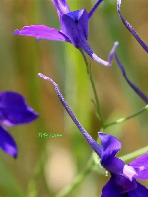 总状花序有3-15花;下部苞片叶状,其他苞片线形;花梗长1.5-3.8厘米,与轴密被贴伏的白色短柔毛;小苞片生花梗中部或上部,线形或丝形,长3.5-7毫米;萼片紫蓝色,椭圆形或宽椭圆形,长1.2-1.8厘米,外面有短柔毛,距钻形,长1.7-2(-2.3)厘米,直或末端稍向下弯曲;花瓣蓝色,无毛,顶端圆形;退化雄蕊蓝色,瓣片近圆形或宽倒卵形,顶端全缘或微凹,腹面中央有黄色髯毛;雄蕊无毛;心皮3,子房密被贴伏的短柔毛。蓇葖直,长1.4-1.9厘米;种子倒卵状四面体形,长约2毫米,沿稜有翅。5-10月开花。