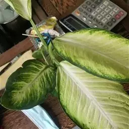 叶鞘长,叶片薄革质,翠绿色,通常(特别是叶面)有多数不规则的纯黄色斑块,全缘,不等侧的卵形或卵状长圆形,先端短渐尖,基部深心形,长32-45厘米,宽24-36厘米,I级侧脉8-9对,稍粗,两面略隆起,与强劲的中肋成70°-80°(-90度)锐角,其间II级侧脉较纤细,细脉微弱,与I、II级侧脉网结。
