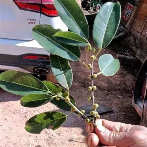 榕果单生叶腋,大而梨形,直径3-5厘米,顶部下陷,成熟时紫红色或黄色, 基生苞片3,卵形;瘦果透镜状。花果期5-7月。