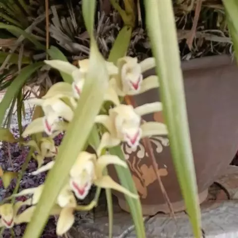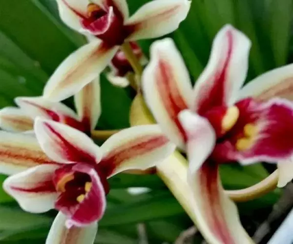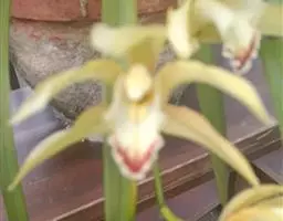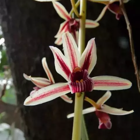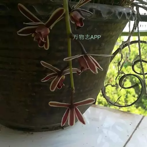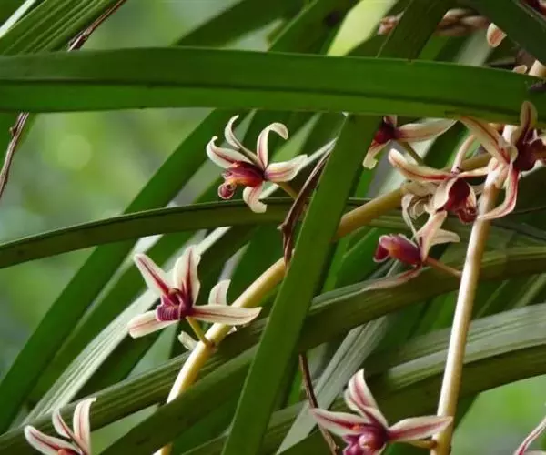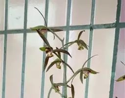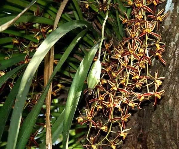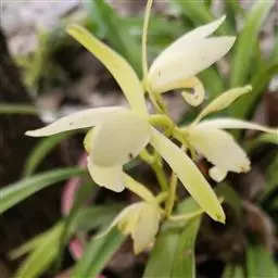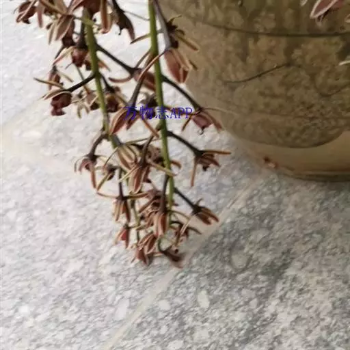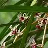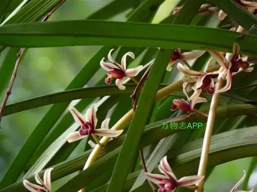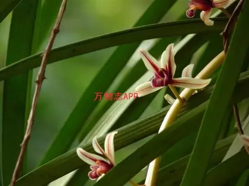 纹瓣兰 花葶从假鳞茎基部穿鞘而出,下垂,长20-60厘米;总状花序具(15-)20-35朵花;花苞片长2-5毫米;花梗和子房长1.2-2厘米;花略小,稍有香气;萼片与花瓣淡黄色至奶油黄色,中央有1条栗褐色宽带和若干条纹,唇瓣白色或奶油黄色而密生栗褐色纵纹;萼片狭长圆形至狭椭圆形,长1.5-2厘米,宽4-6毫米;