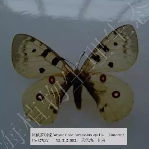 阿波罗绢蝶:翅展约7-8.4厘米。前翅较圆,白垩色,翅表有许多黑点、灰白斑及无鳞透明区,…