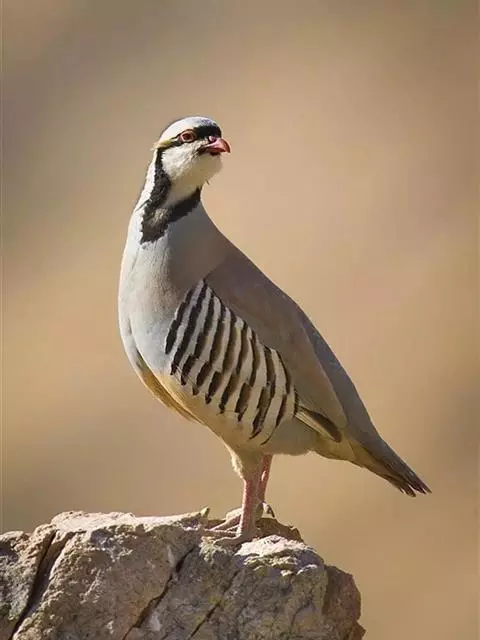 褐胸山鹧鸪:雄鸟体长22厘米,体重310克;雌鸟体长23厘米,体重220-275克。前额皮黄白色,…