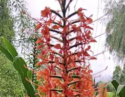 红姜花(学名:Hedychium coccineum Buch.-Ham.),姜科,姜花属多年生草本植物,高可达2m。叶片狭线形,穗状花序多较稠密,圆柱形,花红色。蒴果开裂,种子红色。6-8月开花,10月结果。