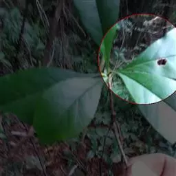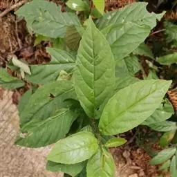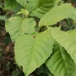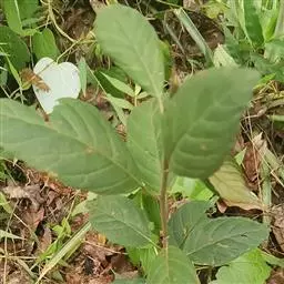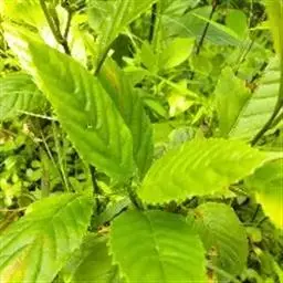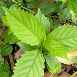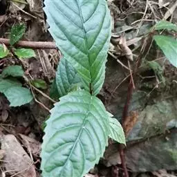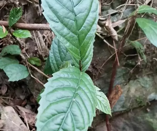 叶片纸质或近坚纸质,广椭圆状卵形至椭圆形,顶端急尖或突然渐尖,基部楔形,长7-11厘米,宽3-5厘米,边缘从中下部以上具粗锯齿,下部常全缘,幼时两面被密长硬毛,以后叶面除脉外近无毛,背面被长硬毛,中脉隆起,侧脉7-9对,尾端直达齿尖,叶柄长7-10毫米,被长硬毛或短柔毛。