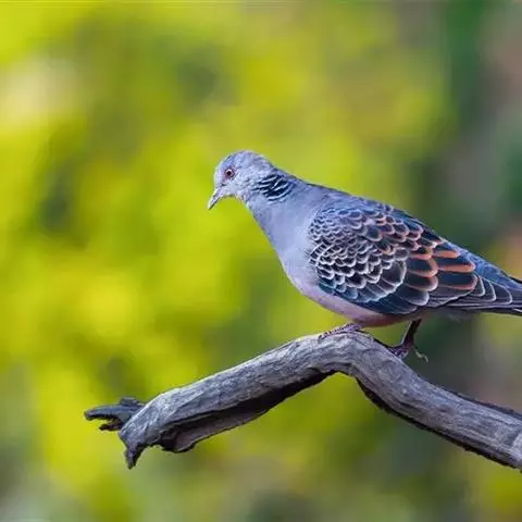 山斑鸠,是鸽形目鸽鸠科斑鸠属鸟类,又名金背斑鸠、棕背斑鸠、山鸠、金背鸠、麒麟斑、麒麟鸠、东方斑鸠、绿斑鸠、山鸽子。山斑鸠颈侧具明显黑白色条纹的块状斑,上体深褐色、具扇贝状斑纹,羽缘棕色,尾羽近黑色,下体多偏粉色。虹膜黄色,喙灰色,脚粉色。山斑鸠是留鸟,在中国常见且分布广泛。此外,还分布于不丹、尼泊尔、巴基斯坦、印度、日本等国。栖息于针阔混交林、季风常绿阔叶林、果园及农耕区,多成对活动于开阔农耕区、村舍、寺院周围及防火林带。取食于地面,主要觅食植物种子、果实、嫩芽等,也吃昆虫。山斑鸠飞翔时鼓翼快速,叫声为反复而低沉的“咕咕咕”声。繁殖期在4-7月,营巢于林中树上,通常一年繁殖2窝,窝卵数2枚,由雌雄亲鸟轮流孵卵,孵化期18~19天。山斑鸠的肉、卵可食,肉入药可益气明目、强筋壮骨,治久病气虚、衰弱无力、两目昏暗等病症。山斑鸠啄食杂草种子,对农田清除杂草有益;但有时也刨食农作物及树的种子。山斑鸠