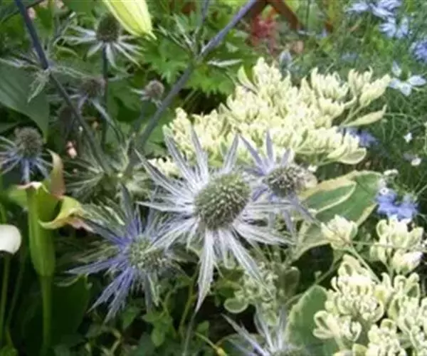 扁叶刺芹俗称海冬青或滨刺芹,从1800年开始在美国就已开始种植。扁叶刺芹是多年生草本,根生叶呈莲座状为深绿色,茎生叶蓝色,开亮蓝色花,喜光,喜疏松排水好的的土壤。耐干旱性很强,是一种典型抗旱植物。经过国内栽培引进实验,证明其具有半耐荫的特性。