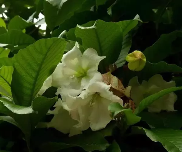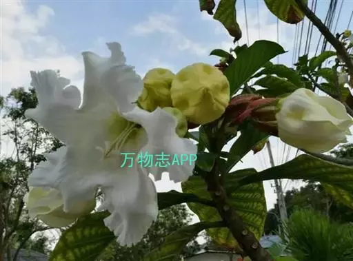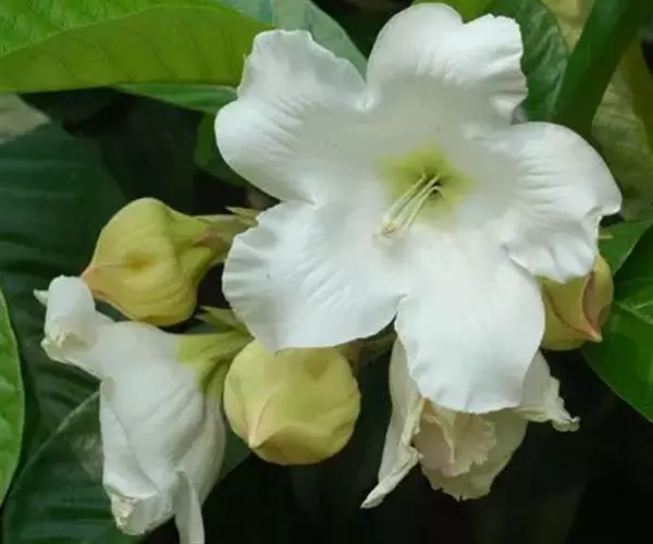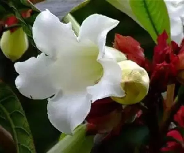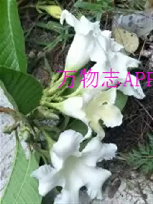 清明花为常绿木质大藤本,具乳汁,茎有皮孔;卵形叶对生,先端锐尖,有小毛,侧脉明显;聚伞花序顶生,着花3—5朵,有时更多;花大,漏斗形,白色,有香气,花冠5裂片;蓇葖果形状多变,内果皮亮黄色,种子有白色绢质种毛。果期秋冬季。根、叶供药用,可治风湿性腰腿痛、跌打损伤等。