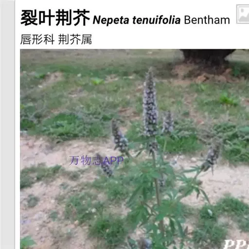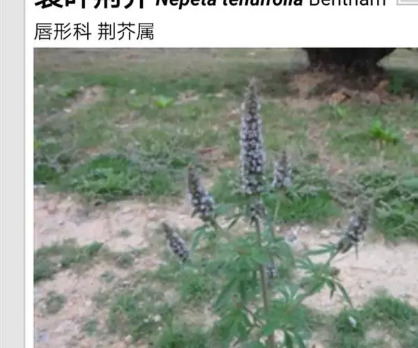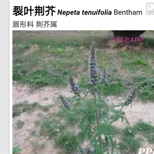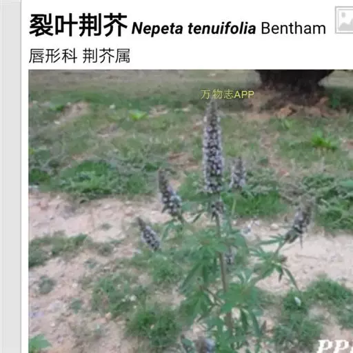 裂叶荆芥(学名:Nepeta tenuifolia Benth.)是唇形科裂叶荆芥属植物。一年生草本,一年生草本。茎高0.3-1米,四棱形,多分枝,被灰白色疏短柔毛,茎下部的节及小枝基部通常微红色。叶通常为指状三裂,大小不等,长1-3.5厘米,宽1.5-2.5厘米。花序为多数轮伞花序组成的顶生穗状花序,长2-13厘米。小坚果长圆状三棱形,长约1.5毫米,径约0.7毫米,褐色,有小点。花期7-9月,果期在9月以后。