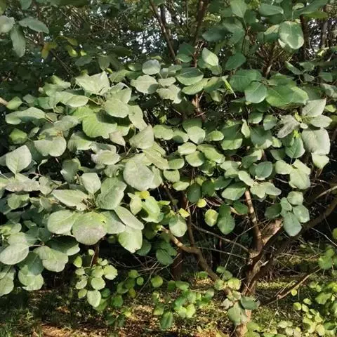 粉背黄栌叶卵圆形,较大,长3.5-10厘米,宽2.5-7.5厘米,无毛,但叶背显著被白粉;叶柄较长,…