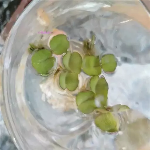紫萍植物的叶状体扁平,阔倒卵形,长5-8毫米,宽4-6毫米,先端钝圆,表面绿色,背面紫色,具掌状脉5-11条,背面中央生5-11条根,根长3-5厘米,白绿色,根冠尖,脱落;根基附近的一侧囊内形成圆形新芽,萌发后,幼小叶状体