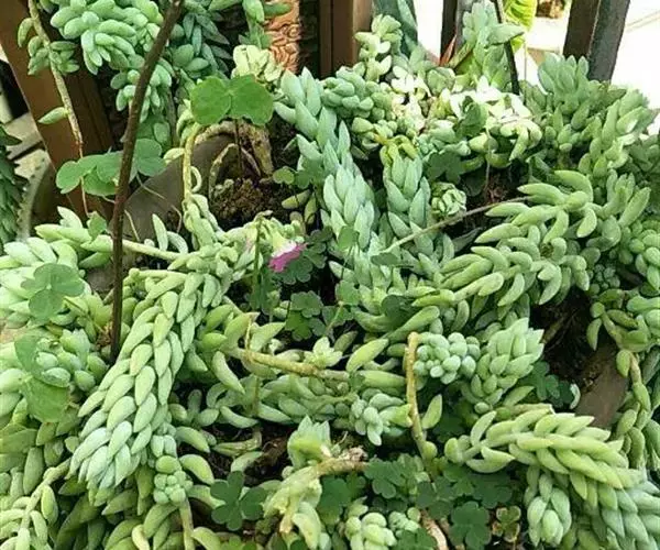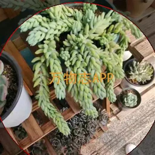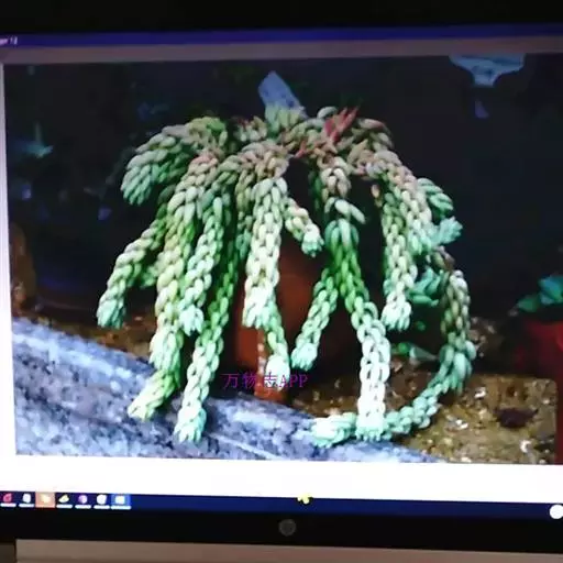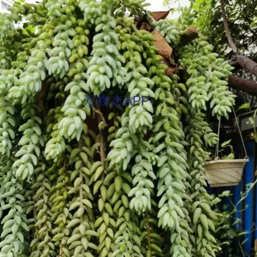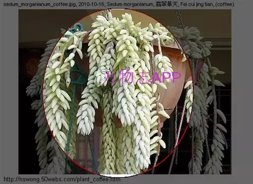 玉缀群生 玉缀 Sedum morganianum 名字起源于日本,日本考古学家在挖掘古坟时,发现一些由玉或玛瑙等宝石制成的玉饰,这些玉饰的造型弯曲如勾,所以便称为“勾玉”,这在日本漫画、小说中相当常见。后来多肉植物界引进玉缀时,观察她叶片的形状很像勾玉,而整串的叶片犹如成串的勾玉,所以这植物便命名为玉つづり,つづり日文就是“缀”,缀玉成串的多肉植物便是“玉缀”,很好听且达意的名字。当然引申意思也可以称为“玉串”或“玉帘”,因此玉缀的别名也有玉帘、玉串、玉珠帘。