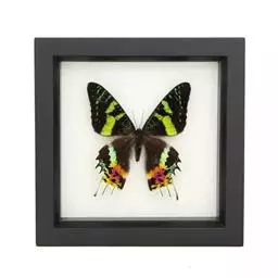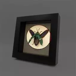翅展100~125毫米。胸部背面有鬼脸形斑纹,眼点班以上有灰白色大斑,腹部黄色,各环节间有黑色横带,背线蓝色较宽,前翅黑色、青色、黄色相间,内横线、外横线各由数条深浅不同的波状线条组成,中室上有一个灰白色点;后翅黄色,基部、中部及外缘处有较宽的黑色带三条,后角附近有灰蓝色进一块。每年发生一代,成虫七、八月份出现,能吱吱发声,以蛹过冬。幼虫危害胡麻等作物。
