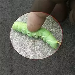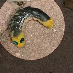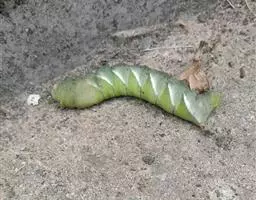 幼虫体长约 9 至 12 厘米。体型肥大,体色有黄、绿、褐、灰等多种,体侧有斜向的斑纹(但会因个体差异而有所不同)。