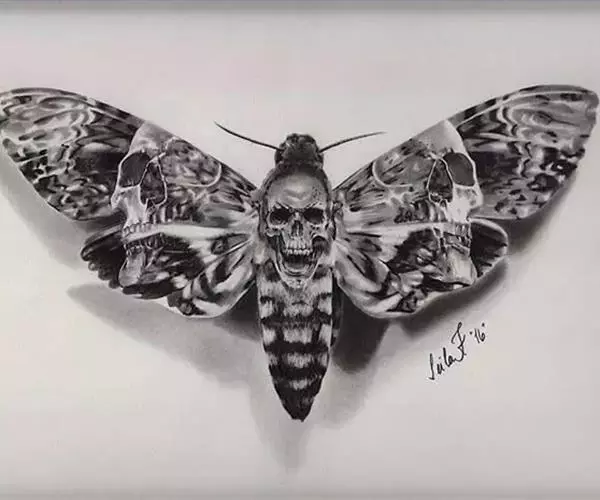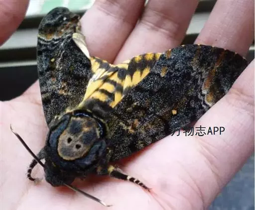 展翅宽100~125mm。翅膀颜色以杂乱的深黑褐色为主;最大特征是胸部背侧有1个骷髅头般的花纹。雌雄差异不明显。