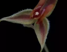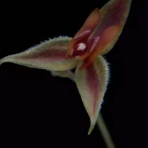 花瓣卵状三角形,长约5毫米,中部宽4毫米,先端紫褐色、钝并且具细尖,中部以上边缘具流苏,近先端处尤甚,具3条脉;唇瓣肉质,舌形,长约7毫米,向外下弯,基部与蕊柱足末端连接而形成活动关节,后半部两侧对折,先端钝,边缘多少具睫毛,近先端处两侧面疏生细乳突;蕊柱长约4毫米;蕊柱翅在蕊柱中部稍向前伸展呈半月形;蕊柱足弯曲,长5毫米,其分离部分长2毫米;蕊柱齿三角形,长约1毫米,先端急尖呈尖牙齿状,药帽前缘具短流苏。花期3-4月。