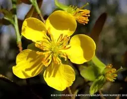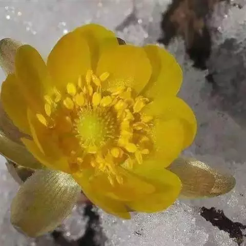 花单生茎顶端,无毛,在开花时围在茎近顶部的叶中;萼片约5,膜质,狭菱形或狭卵形,长约8毫米;花瓣约8,橙黄色,下部黑紫色,倒披针形,长约10毫米;花药宽椭圆形或近球形,长约0.8毫米;心皮多数,子房狭卵形,有1条背肋,顶部渐狭成短花柱。瘦果卵球形,长约3.5毫米,脉网隆起,有明显的背肋和腹肋。6月开花。