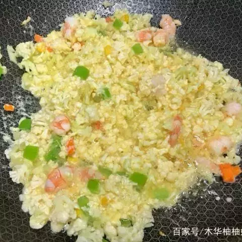 1.锅里放油,油热,将打好的鸡蛋倒入锅中,搅散,再将米饭倒入,与鸡蛋搅匀,并充分炒热;