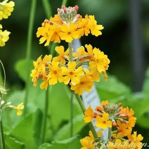 多年生粗壮草本。根状茎粗短,具多数纤维状须根。叶丛高6-50厘米;叶片阔卵形至卵状矩圆形或椭圆形,长3-15(20)厘米,宽4-11(15)厘米,先端圆形,基部心形,边缘具稍钝的牙齿,齿端具胼胝质尖头,上面绿色,鲜时具光泽,干后薄纸质,下面淡绿色,多少被小腺体,中肋稍宽,侧脉11-13对,稍宽扁而隆起,网脉明显;叶柄长3-30厘米,稍短于叶片至长于叶片I-2倍。花葶稍粗壮,高30-120厘米,秃净或有时顶端微被粉;伞形花序多花(通常15-30朵,不少于10朵,最多可达80朵),有时出现第2轮花序;苞片阔披针形至矩圆形,长1-3厘米,先端常具小齿,基部膨大或稍下延成垂耳状;花梗长2-10厘米,多少被黄粉,开花时下弯,果时直立;花萼钟状,长8-10毫米,具不明显的5脉,外面密被黄粉,分裂略超过全长的1/3,裂片三角形至狭三角形,先端锐尖;花冠鲜黄色,干后常带绿色. ,长17-25毫米,冠檐直径1-2厘米,裂片卵状矩圆形至阔倒卵形,内面密被黄粉,先端微具凹缺;长花柱花