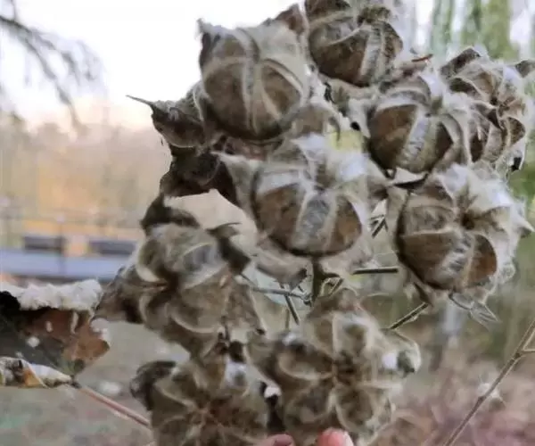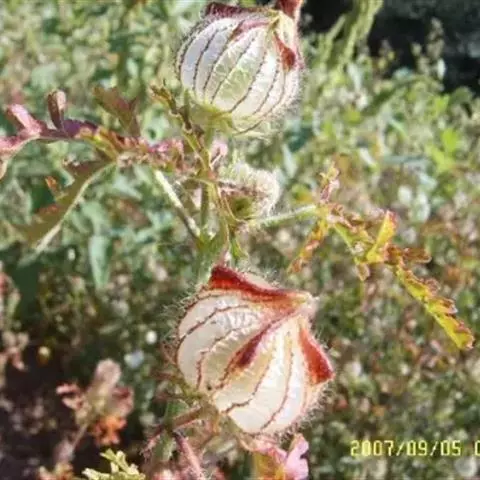 木芙蓉 蒴果扁球形,直径约2.5厘米,被淡黄色刚毛和绵毛,果爿5;种子肾形,背面被长柔毛。