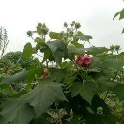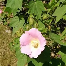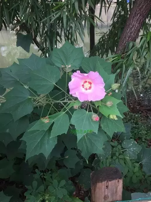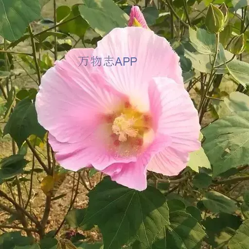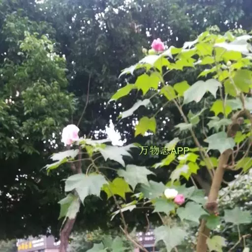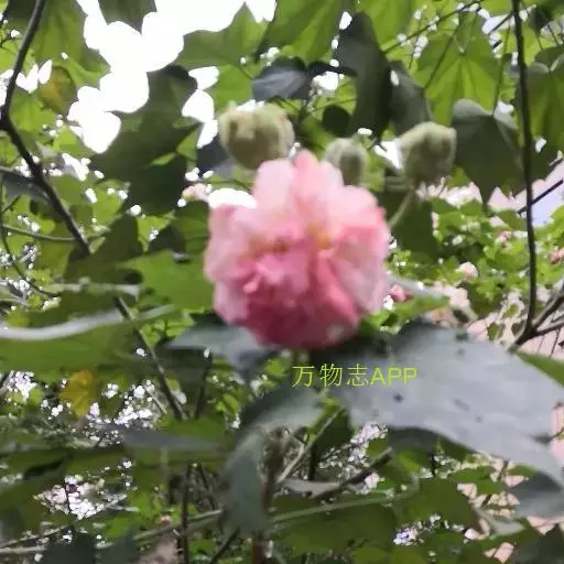 木芙蓉 木芙蓉(原变型)为落叶灌木或小乔木,高2-5米;小枝、叶柄、花梗和花萼均密被星状毛与直毛相混的细绵毛。叶宽卵形至圆卵形或心形,直径10-15厘米,常5-7裂,裂片三角形,先端渐尖,具钝圆锯齿,上面疏被星状细毛和点,下面密被星状细绒毛;主脉7-11条;叶柄长5-20厘米;托叶披针形,长5-8毫米,常早落。
