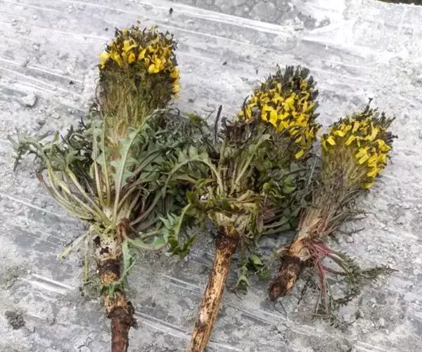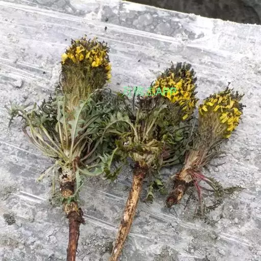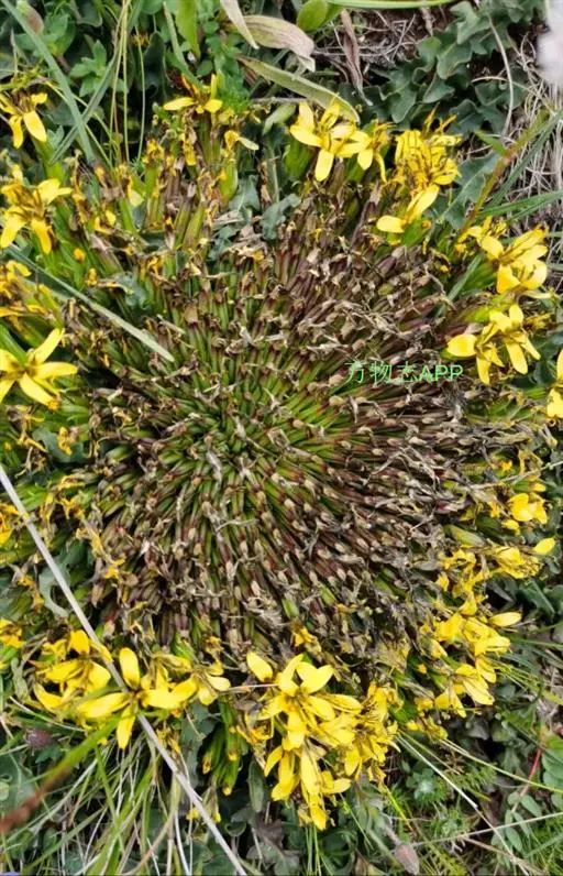 多年生草本。根长,垂直直伸,倒圆锥状。茎极短或几无茎,高1-8厘米。叶稠密,集中排列在团伞花序下部,线形或长椭圆形,长1-2厘米,宽1-4毫米,皱波状羽状浅裂或深裂,叶柄宽扁,长达1厘米,叶柄与叶片被稀疏或稠密的长硬毛,极少无毛。头状花序多数在茎端排成团伞状花序,团伞花序直径2-9厘米,花序梗长5毫米。总苞狭圆柱状,直径2毫米;总苞片2层,外层2枚,线形,紧靠内层,长6-12毫米,被稀疏的长或短硬毛;内层总苞片4枚,近等长,长椭圆形,长约7毫米,宽约1.5毫米,顶端钝或圆形,外面有稀疏长柔毛或无毛。舌状小花黄色,4枚。瘦果长倒圆锥状,微压扁,下部收窄,顶端截形,长2.5毫米,有17条粗细不等的纵肋。冠毛鼠灰色或浅黄色,长约8毫米,细锯齿状。花果期7-8月。