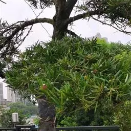 罗汉松为乔木,终年常绿,风姿朴雅,植株高可达 18 公尺,但亦可修剪使保持低矮,树皮充满皱褶。