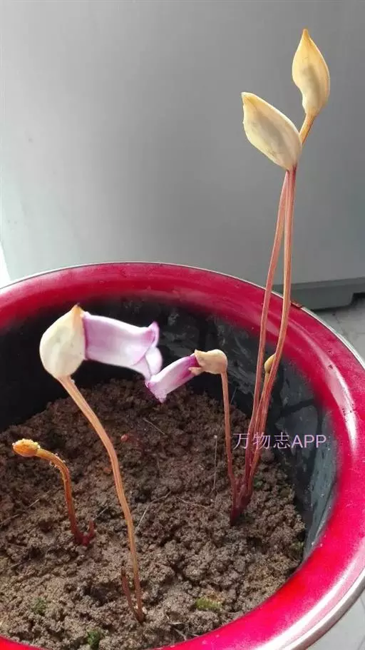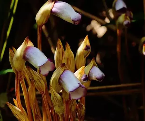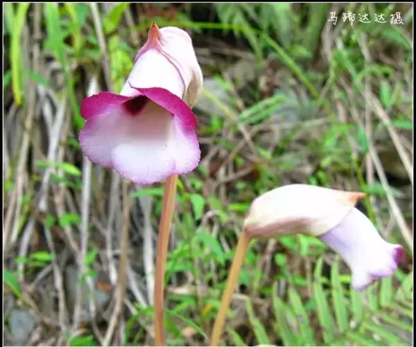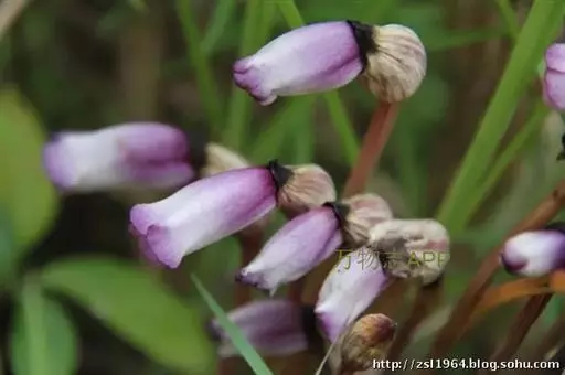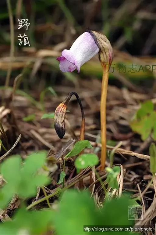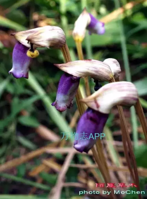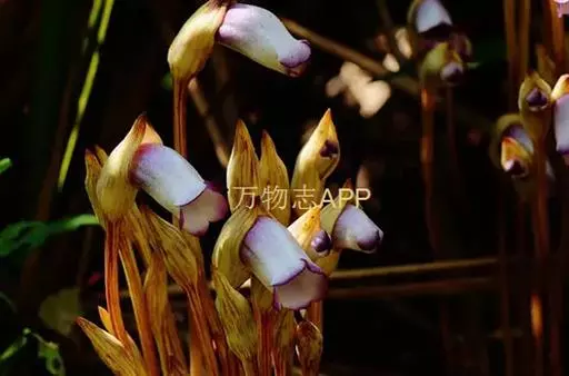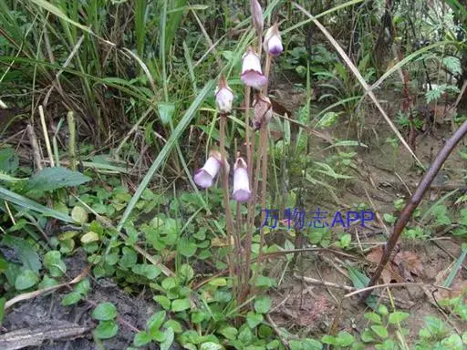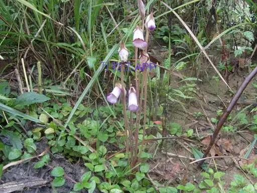 一年生寄生草本,高15-40(-50)cm。根稍肉质,具树状细小分枝。茎黄褐色或紫红色,不分枝或自近基部处有分枝,偶尔自中部以上分枝。叶肉红色,卵状披针形或披针形,长5-10mm,宽3-4mm,两面光滑无毛。花常单生茎端,稍俯垂。花梗粗壮,常直立,长10-30(-40)cm,直径约3mm,无毛,常具紫红色的条纹。花萼一侧裂开至近基部,长2.5-4.5(-6.5)cm,紫红色、黄色或黄白色,具紫红色条纹,先端急尖或渐尖,两面无毛。花冠带粘液,常与花萼同色,或有时下部白色,上部带紫色,凋谢后变绿黑色,干时变黑色,长4-6cm,不明显的二唇形,筒部宽,稍弯曲,在花丝着生处变窄,顶端5浅裂,上唇裂片和下唇的侧裂片较短,近圆形,全缘,下唇中间裂片稍大。雄蕊4枚,内藏,花丝着生于距筒基部1.4-1.5cm处,长7-9mm,紫色,无毛,花药黄色,有粘液,成对粘合,仅1室发育,下方一对雄蕊的药隔基部延长成距。子房1室,侧膜胎座4个,横切面有极多分枝,花柱无毛,长1-1.5cm,柱头膨大,肉质,淡黄色,盾状。蒴果圆锥状或长卵球形,长约2-3cm,2瓣开裂。种子多数,细小,椭圆形,黄色,长约0.04mm,种皮网状。花期4-8月,果期8-10月。