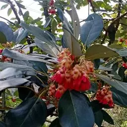 红花荷:金缕梅科红花荷属常绿乔木,高可达12米,嫩枝颇粗壮,叶厚革质,卵形,光滑无毛,有三出脉,叶…