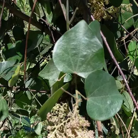 木质大藤本,长可达10余米或更长,茎褐色,具深沟状裂纹,小枝和叶柄具直纹。叶革质,长圆状卵形,有时阔卵形或阔卵状近圆形,长约10-25厘米,宽约2.5-9厘米,顶端近骤尖或短渐尖,基部圆或钝,有时近心形或楔形,两面无毛;掌状脉3-5条,中脉每边通常有3条侧脉,连同网脉均在下面凸起;叶柄长5-14厘米,呈不明显盾状着生。