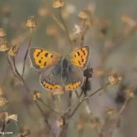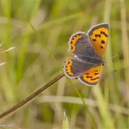 橙灰蝶Lycaena dispar Hauorth,鳞翅目、灰蝶科。这类蝴蝶雌雄异型,雄蝶前翅翅面…