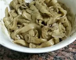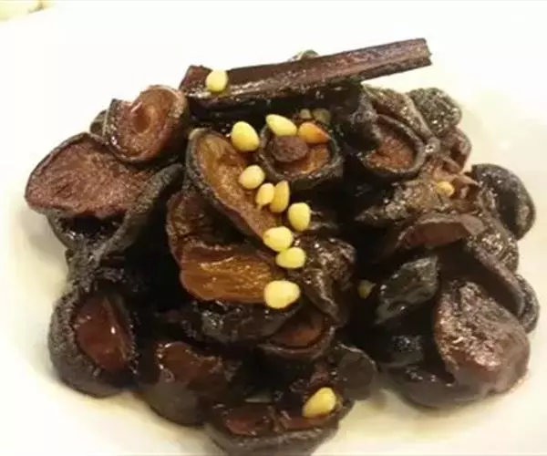 3.锅留余油,下甜面酱略微煸炒,放白糖,酱油,盐,投入香菇不断翻炒,再加适量清水,用大火烧开,改用中火烧透,下味精,再下松仁翻炒, 收干卤汁,放香油,起锅装盘,冷却后食用。