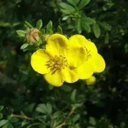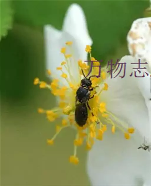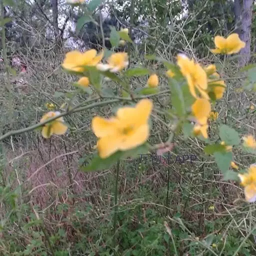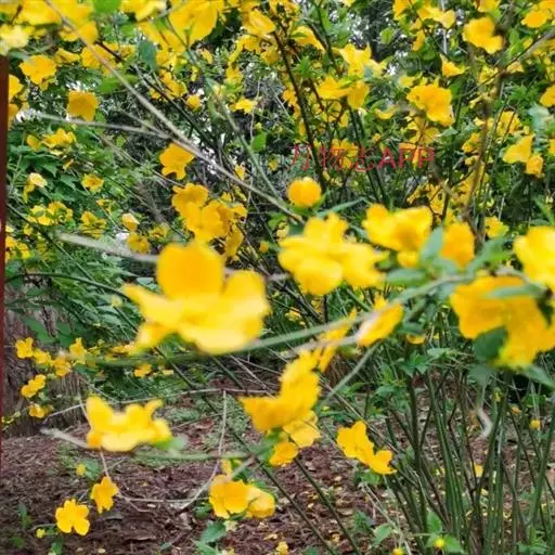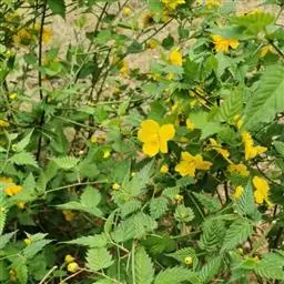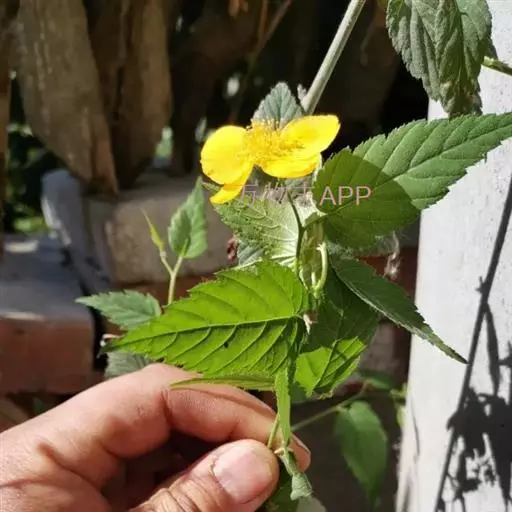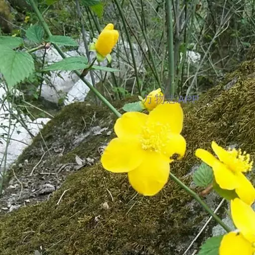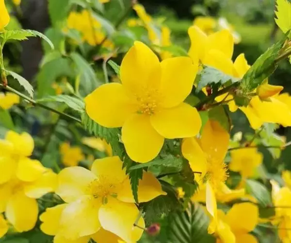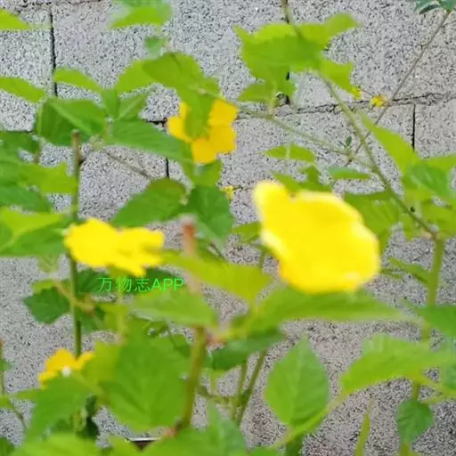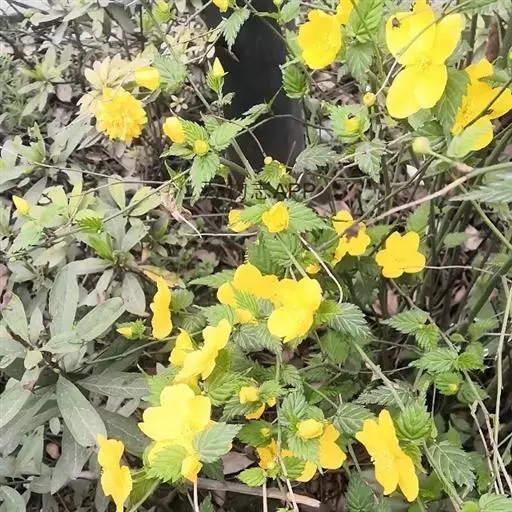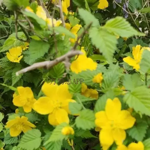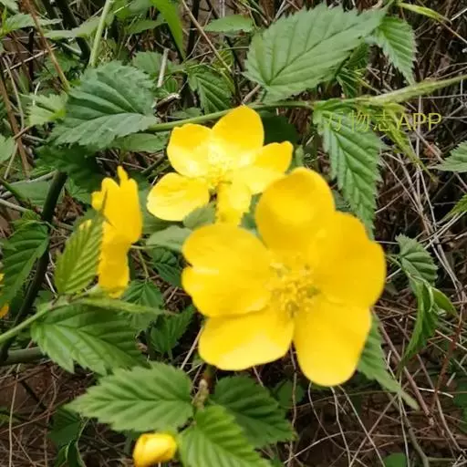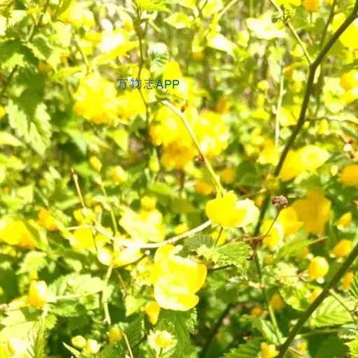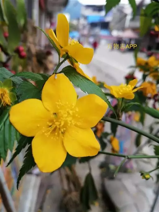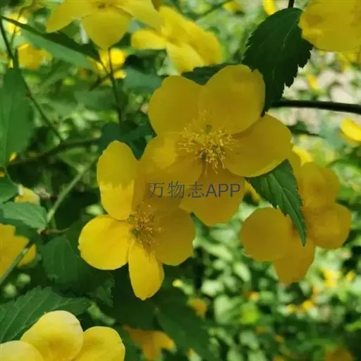棣棠花(学名:Kerria japonica (L.) DC.):灌木,高1-2米;小枝有棱,绿色,无毛。叶卵形或三角形,先端渐尖,基部截形或近圆形,边缘有重锯齿,上面无毛或有稀疏短柔毛,下面微生短柔毛;叶柄无毛;有托叶。花单生于侧枝顶端;无毛;花直么3-5厘米;萼筒扁平,裂片5,卵形,全缘,无毛;花瓣黄色,宽椭圆形;雄蕊多数,离生,长约花瓣之半;心皮5-8,有柔毛,花柱约与雄蕊等到长。瘦查黑色,无毛,萼裂片宿存。