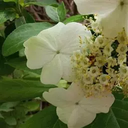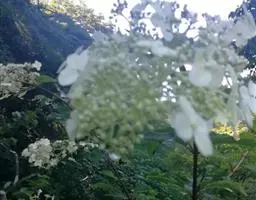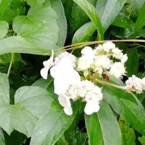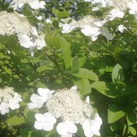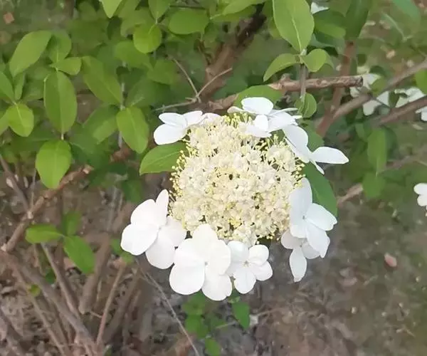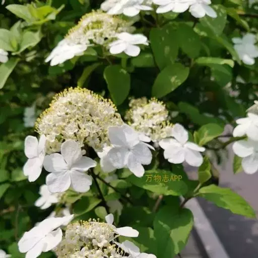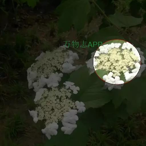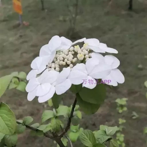 聚伞花序直径8-15厘米,全部由大型不孕花组成,总花梗长1-2厘米,第一级辐射枝5条,花生于第三级辐射枝上;萼筒筒状,长约2.5毫米,宽约1毫米,无毛,萼齿与萼筒几等长,矩圆形,顶钝;花冠白色,辐状,直径1.5-4厘米,裂片圆状倒卵形,筒部甚短;雄蕊长约3毫米,花药小,近圆形;雌蕊不育。花期4-5月。