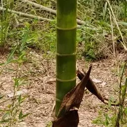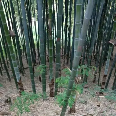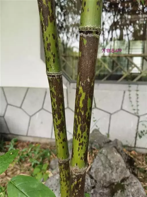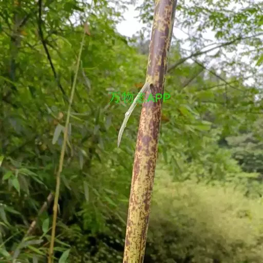 斑竹 乔木或灌木状竹类。 竿高可达20米,粗达15厘米,幼竿无毛,无白粉或被不易察觉的白粉,偶可在节下方具稍明显的白粉环;节间长达40厘米,壁厚约5毫米;竿环稍高于箨环。