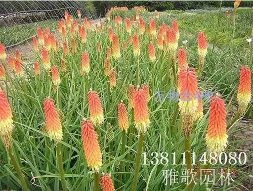 火炬花 火炬花为多年生草本植物,根肉质,自地下茎的节位上发出,一般寿命为1-2年。茎着生于地下短缩,因而整棵植株的地下部分形成一个较庞大的根茎群。短缩茎的顶芽常孕育为花芽,侧芽容易萌发,形成许多分蘖。大量侧芽与老根茎潜伏芽的萌芽期。