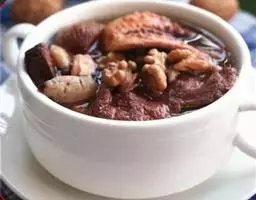 1 将鸭宰杀褪毛,去内脏洗净,放入沸水锅中稍氽取出,盛入沙锅,加清水1000克,酒10克、葱段、姜片,旺火煮沸,十五分钟后捞出。