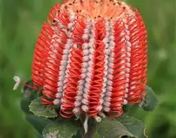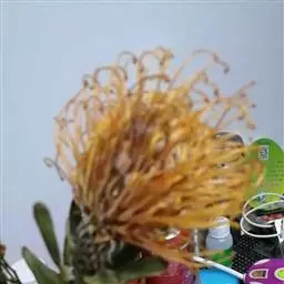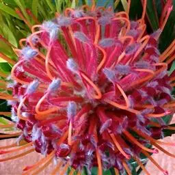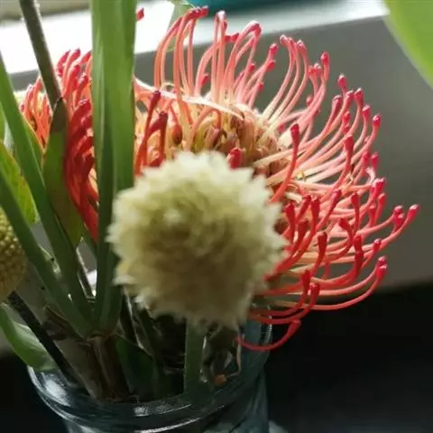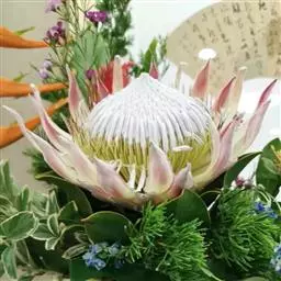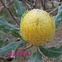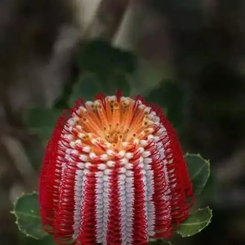 帝王花,山龙眼科帝王花属多年生常绿灌木植;茎干粗壮,叶色翠绿光亮;花朵呈圆球状;其苞片有的完全打开,…