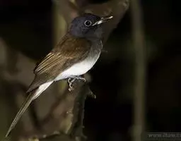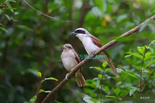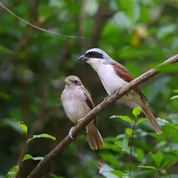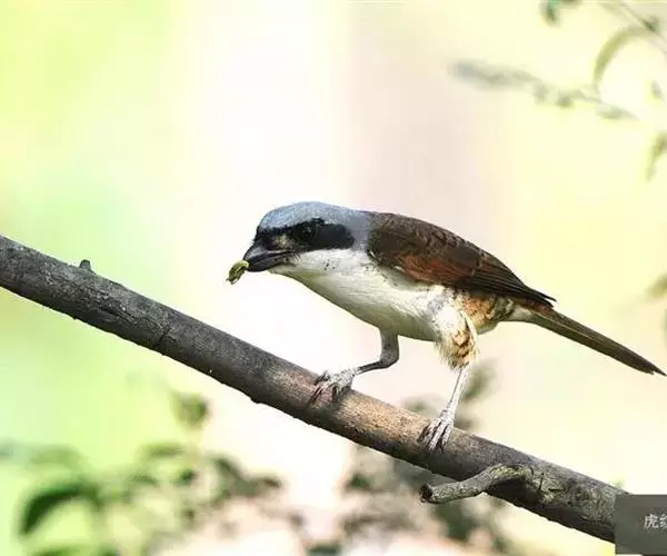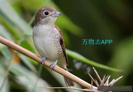 虎纹伯劳(学名:Lanius tigrinus):全长165毫米左右。雄性成鸟:额基、眼先和宽阔的贯眼纹黑色;前额、头顶至后颈蓝灰色;上体余部包括肩羽及翅上覆羽栗红褐色,杂以黑色波状横斑;飞羽暗褐色,外翻具棕褐色羽缘;尾羽棕褐色,具不明显的褐色横斑,外侧尾羽端缘棕白色;下体纯白色,两胁略沾蓝灰色;覆腿羽白杂以黑斑。雌性成鸟羽色与雄鸟相似,但前额基部黑色较小,眼先及过眼黑纹沾褐,头顶灰色及背羽的栗褐色均不如雄鸟鲜艳;胁部缀以黑褐色鳞状横斑。