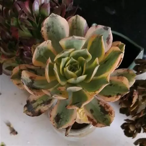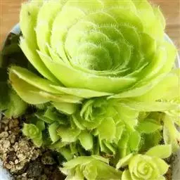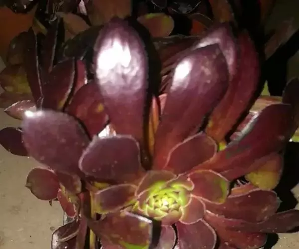 叶稍薄,在枝头集成20厘米的菊花形莲座叶盘,叶片倒长卵形或倒披针形,长5厘米-7厘米,顶端有小尖,叶缘有白色睫毛状细齿,叶色黑紫,冬季则为绿紫色。总状花序,长约10厘米,小花黄色,花后植株通常枯死。适宜放在家里。