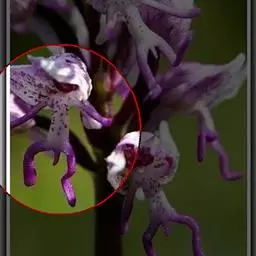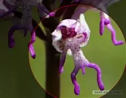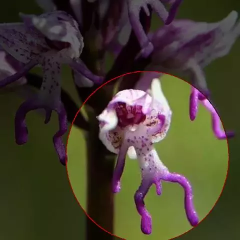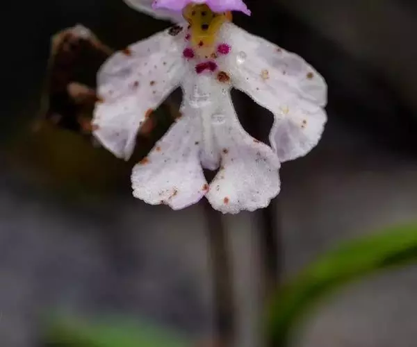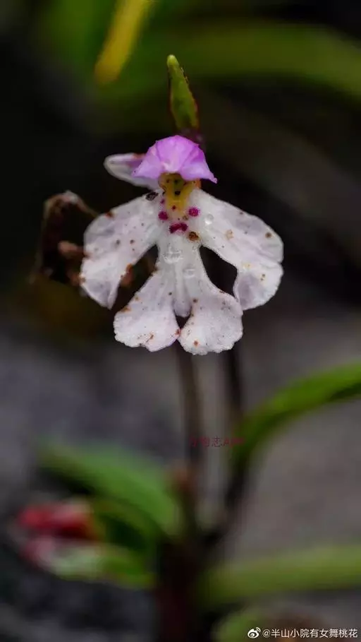 植株高6-10厘米。块茎小,卵球形或圆球形,长约5毫米,肉质。茎纤细,直立或近直立,基部具1-2枚筒状鞘,下部光滑,在近基部至中部具1枚叶,顶生1朵花。叶片披针形、倒披针状匙形或狭长圆形,长2-3厘米,宽6-10毫米,先端急尖或钝,基部收狭成抱茎的鞘。花苞片线状披针形,先端急尖,较子房长,但短于花;子房纺锤形,扭转,无毛,连花梗长6-11毫米;花中等大,淡紫色,粉红色或白色,具紫色斑点;萼片先端钝,具1脉,中萼片直立,凹陷呈舟状,狭卵形,长4毫米,下部宽1.6毫米;侧萼片狭长圆状椭圆形,长约5毫米,宽约1.6毫米;花瓣直立,斜卵形,与中萼片等长而较宽,并与中萼片相靠合,具1脉;唇瓣向前伸展,张开,内面被短柔毛,长、宽均约8毫米,近基部收狭成短爪,基部具距,中部之下3裂,侧裂片楔状长圆形,先端截形或钝,边缘全缘或微波状,中裂片倒卵形,较侧裂片宽多,先端凹缺呈2浅裂,边缘全缘或微波状;距圆筒状,下垂,长3-4毫米,末端钝,长为子房的1/3或1/2;蕊柱短,直立;花药近球形,直立,药室基部靠近,顶部叉开;花粉团近球形,具花粉团柄和粘盘,粘盘卵形;蕊喙小,三角形,直立;柱头2个,隆起,近四方形;退化雄蕊2个,小,圆形。花期7-8月。