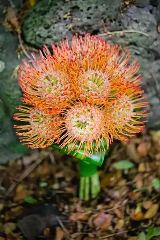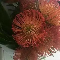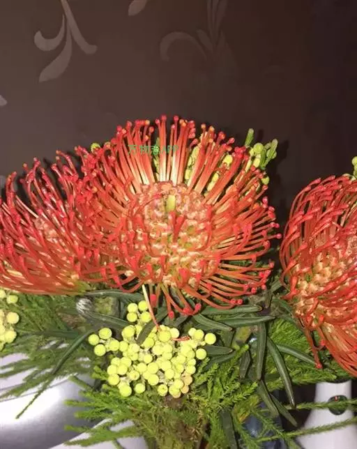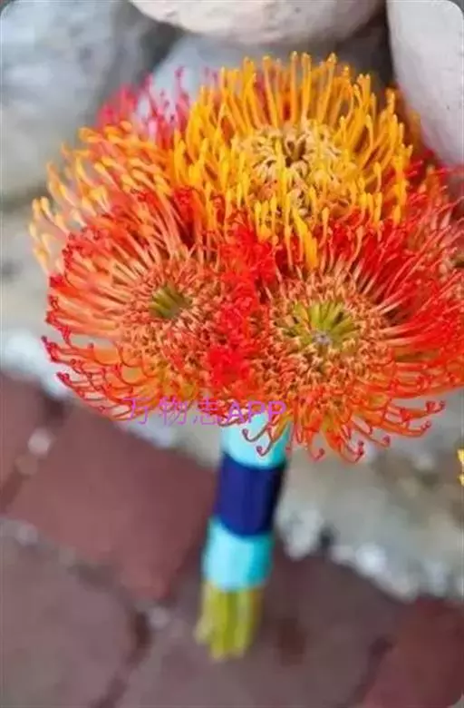 针垫花(Leucospermum sp.)又名风轮花、针包花、针垫山龙眼等。全属植物约50多种,主要分布在南非和津巴布韦等地。常绿蔓性灌木,少数为小乔木,叶轮生,硬质,多为针状、心脏形或矛尖状,边缘或叶尖有锯齿;花序密集,头状花序,单生或少数聚生;花冠小,针状。从它的植物学特征的描述可以看出这种植物有些古老和原始。如今的针垫花是通过众多的鲜花布景被世界各地的游人认识,从而走出国门,并分布于世界的每一个角落,成为一个非常流行的园艺品种,也被广泛用作鲜切花。