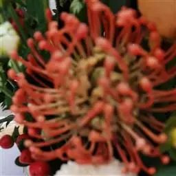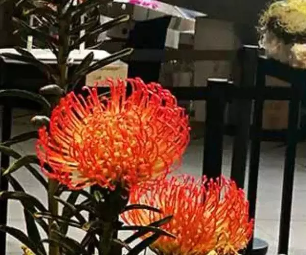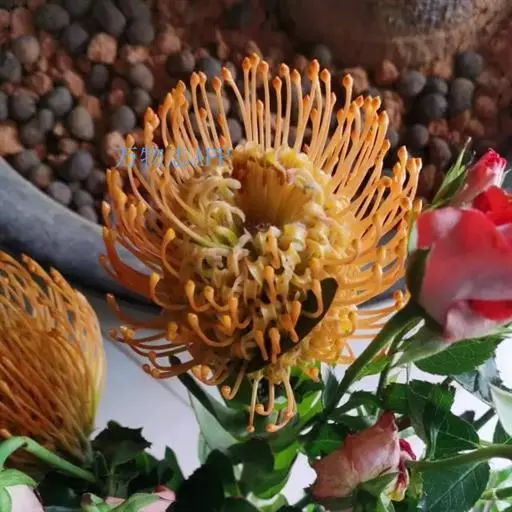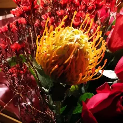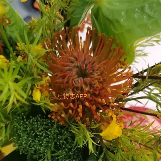 针垫花(Leucospermum sp.)又名风轮花、针包花、针垫山龙眼等,属于山龙眼科针垫花属(Leucospermum)植物。全属植物约50多种,主要分布在南非和津巴布韦等地。常绿蔓性灌木,少数为小乔木,叶轮生,硬质,多为针状、心脏形或矛尖状,边缘或叶尖有锯齿;花序密集,头状花序,单生或少数聚生;花冠小,针状。从它的植物学特征的描述可以看出这种植物有些古老和原始。确实,针垫花是南非本土的植物品种,生长在酸性、贫瘠的土壤环境中,在冬季多雨季节和炎热、干燥的夏季开花。据说,在南非开普角保护区还遗存有世界上为数不多的金黄色针垫花,成为植物王国里不可多得的活化石。如今的针垫花是通过众多的鲜花布景被世界各地的游人认识,从而走出国门,并分布于世界的每一个角落,成为一个非常流行的园艺品种,也被广泛用作鲜切花。