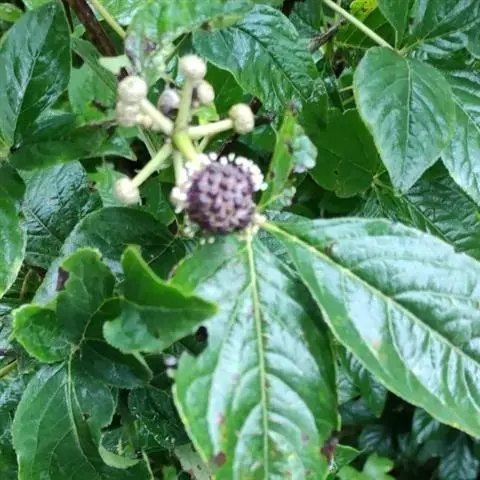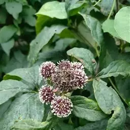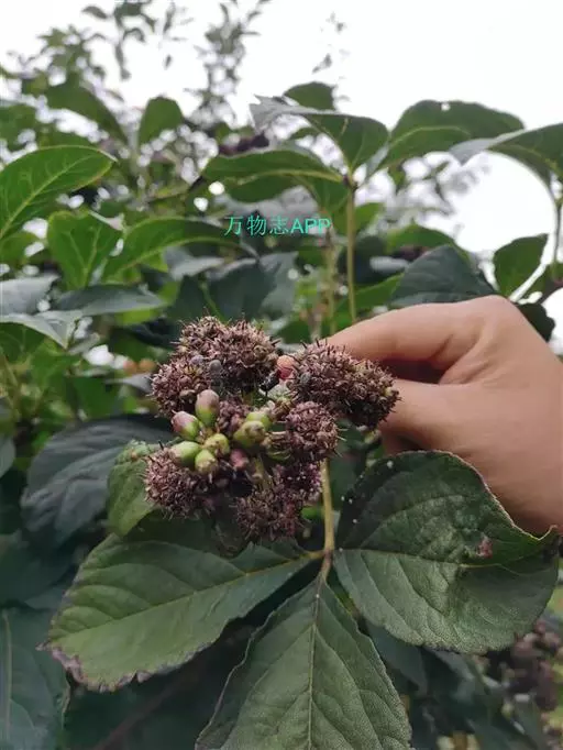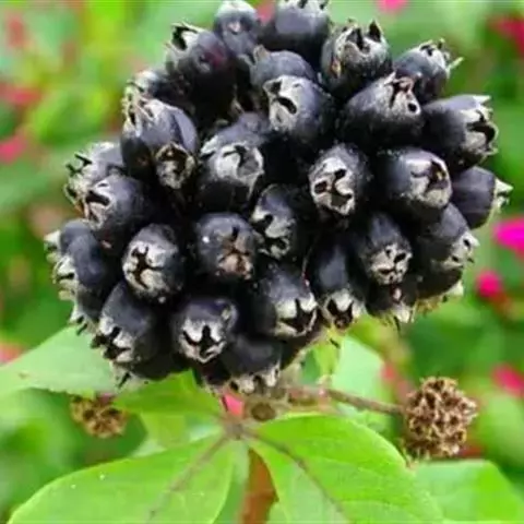 头状花序紧密,球形,直径2-3.5厘米,有花多数,5-6个稀多至10个组成顶生圆锥花序或复伞形花序;总花梗长0.5-3厘米,密生短柔毛;花无梗;萼密生白色绒毛,边缘有5小齿;花瓣5,卵形,浓紫色,长1.5-2毫米,外面有短柔毛,后毛脱落;子房2室,花柱全部合生成柱状,柱头离生。果实倒卵状椭圆球形,黑色,长1-1.5厘米,稍有棱,宿存花柱长达3毫米。花期8-9月,果期9-10月。