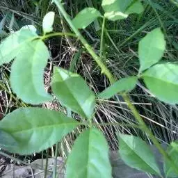 灌木或小乔木,高2-5米;树皮暗灰色或灰黑色,有纵裂纹和粒状裂纹;枝灰色,无刺或疏生刺;刺粗壮,直或弯曲。叶有小叶3-5;叶柄长3-12厘米,无刺或有小刺;小叶片纸质,倒卵形或长圆状倒卵形至长圆状披针形,稀椭圆形,长8-18厘米,宽3-7厘米,先端渐尖,基部楔形,两面均无毛,边缘有不整齐锯齿,稀重锯齿状,侧脉5-7对,明显,网脉不明显;小叶柄长2-10毫米。