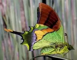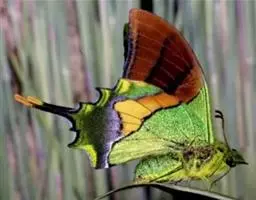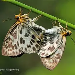 幼虫 幼虫头部淡褐色,腹部淡黄色至绿色,老熟幼虫体长14~19毫米,橘红色。前胸背板淡褐色,上有褐色斑纹,近前缘中央有并列的褐色斑点两颗,两侧各有一条由褐点组成的弧形斑。后缘有两条向前延伸的尖条斑。中、后胸背面各有茸毛片8个,分成二排,前排6个,中间二条较大,后排2个,位于两侧;自三龄以后,毛片周围黑褐色。腹部毛片黄绿色,周围无黑纹,第一至第八节背面各有毛片6个,也分两排,前排4个,后排2个,位于近中间。腹部毛瘤黑色,气门周围亦为黑色。腹足趾钩39个左右,为单行三序环。幼虫一般五龄,少数六龄。预蛹 长约11.5~13.5毫米,淡橙红色,体节膨胀,腹足及尾足收缩。